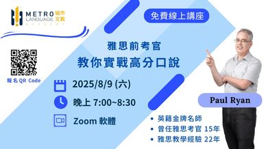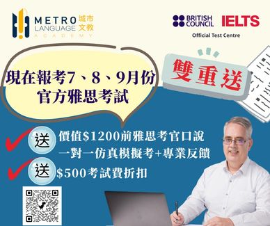 為回饋支持我們的考生,自2025/7/1 起凡報名「城市文教中心」Metro Language Academy 2025年7月、8月、9月的任一場雅思官方考試, 包括UKVI 的考生均可獲得價值$1200的雅思仿真一對一口說模擬考 (口說模擬+15分鐘的專業反饋),由前雅思考官Paul Ryan 親自執考。